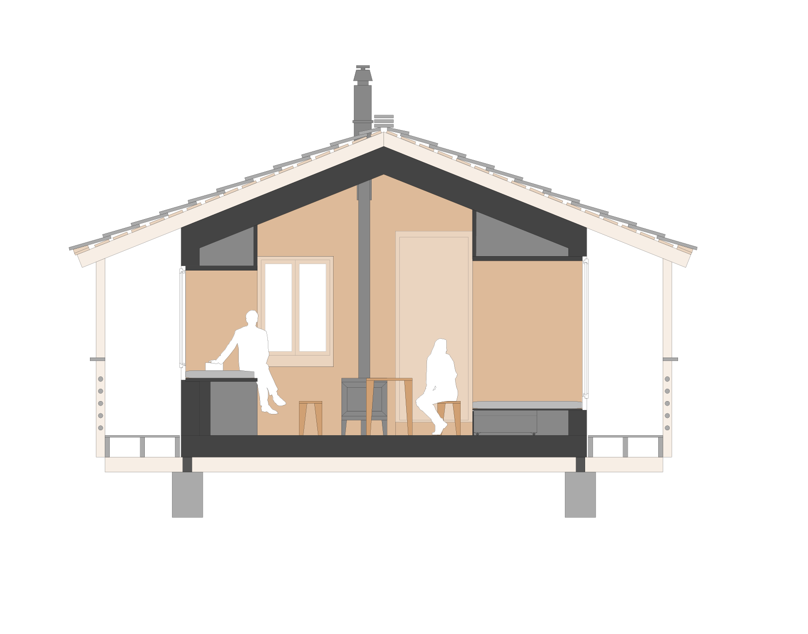 L’espace de vie central, entouré par trois grandes alcôves entièrement vitrées, est baigné de lumière et ouvert sur le paysage. Le poêle à bois vitré au centre permet de chauffer le lieu et de profiter de sa lumière reposante. Il est également équipé pour poser des casseroles et cuire, comme dans un four, des plats en cuisson lente.