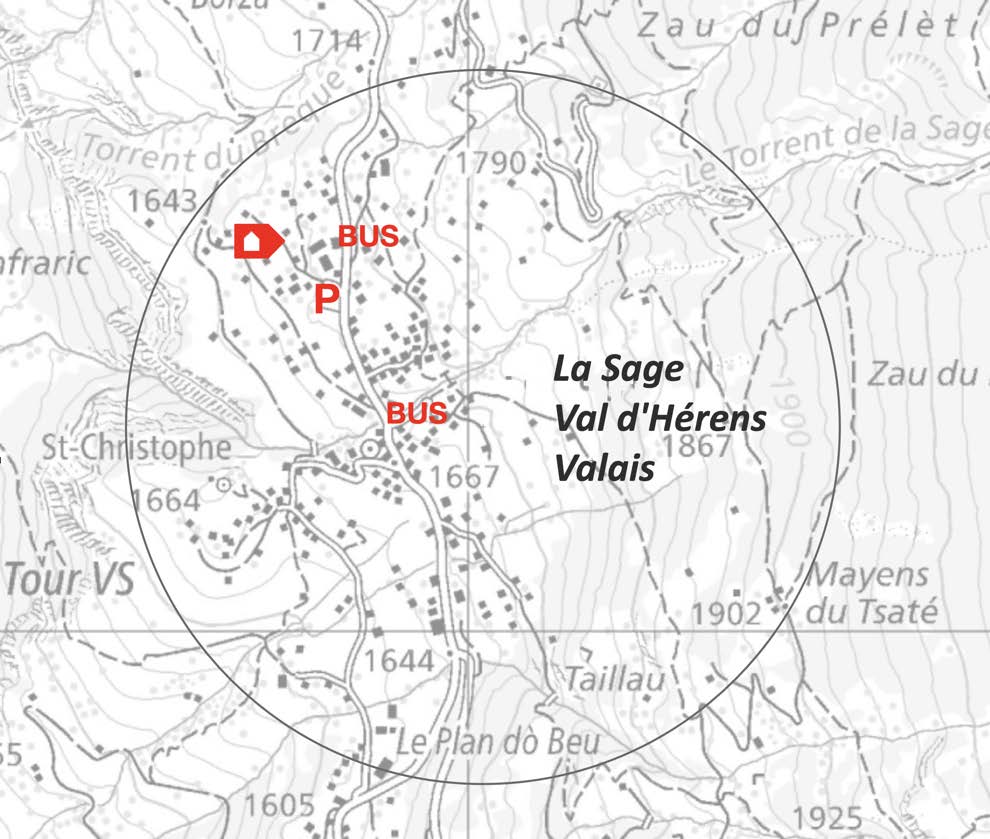 Accessible en transport public avec le bus 381 depuis Sion gare, les arrêts de bus sont à 60m sur la rue principale, Plan la Sage et la Sage village